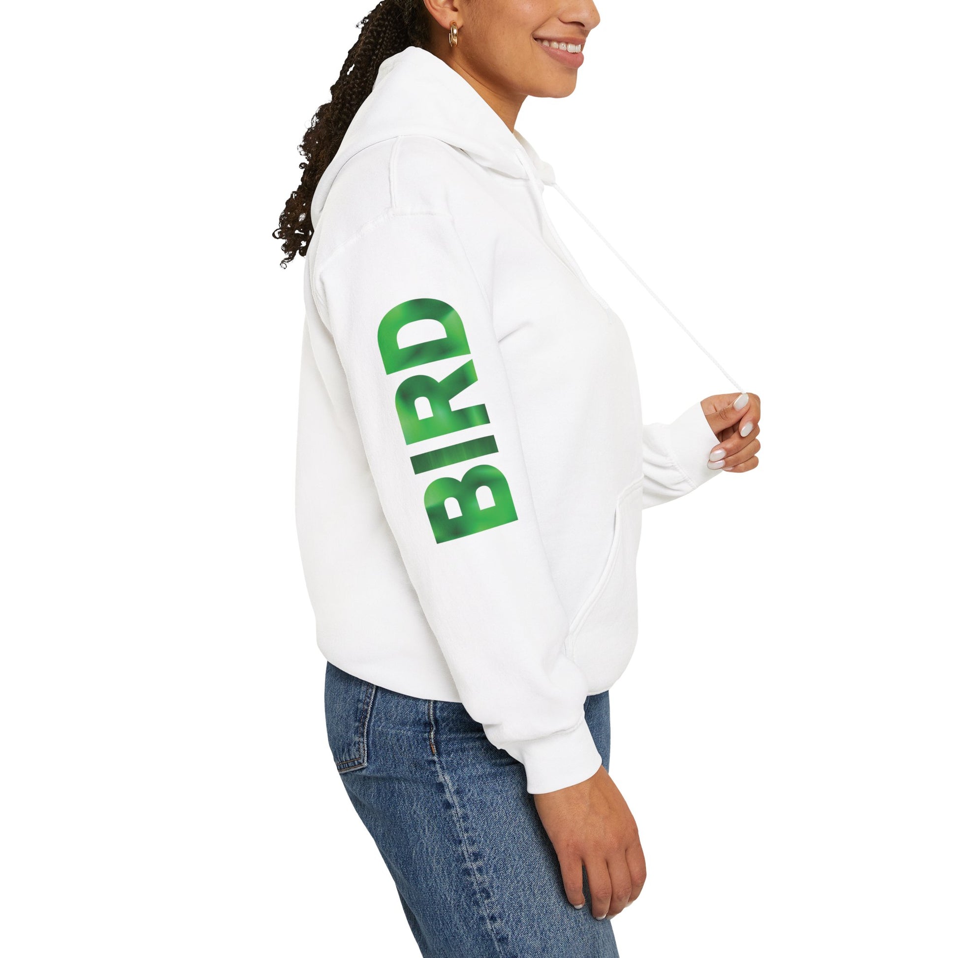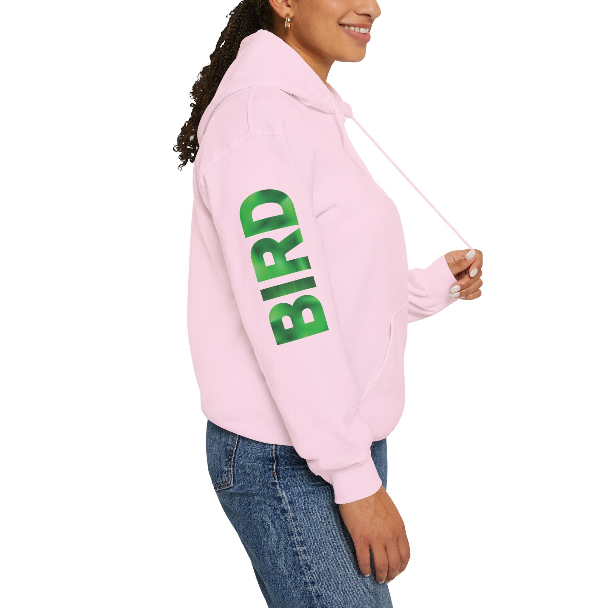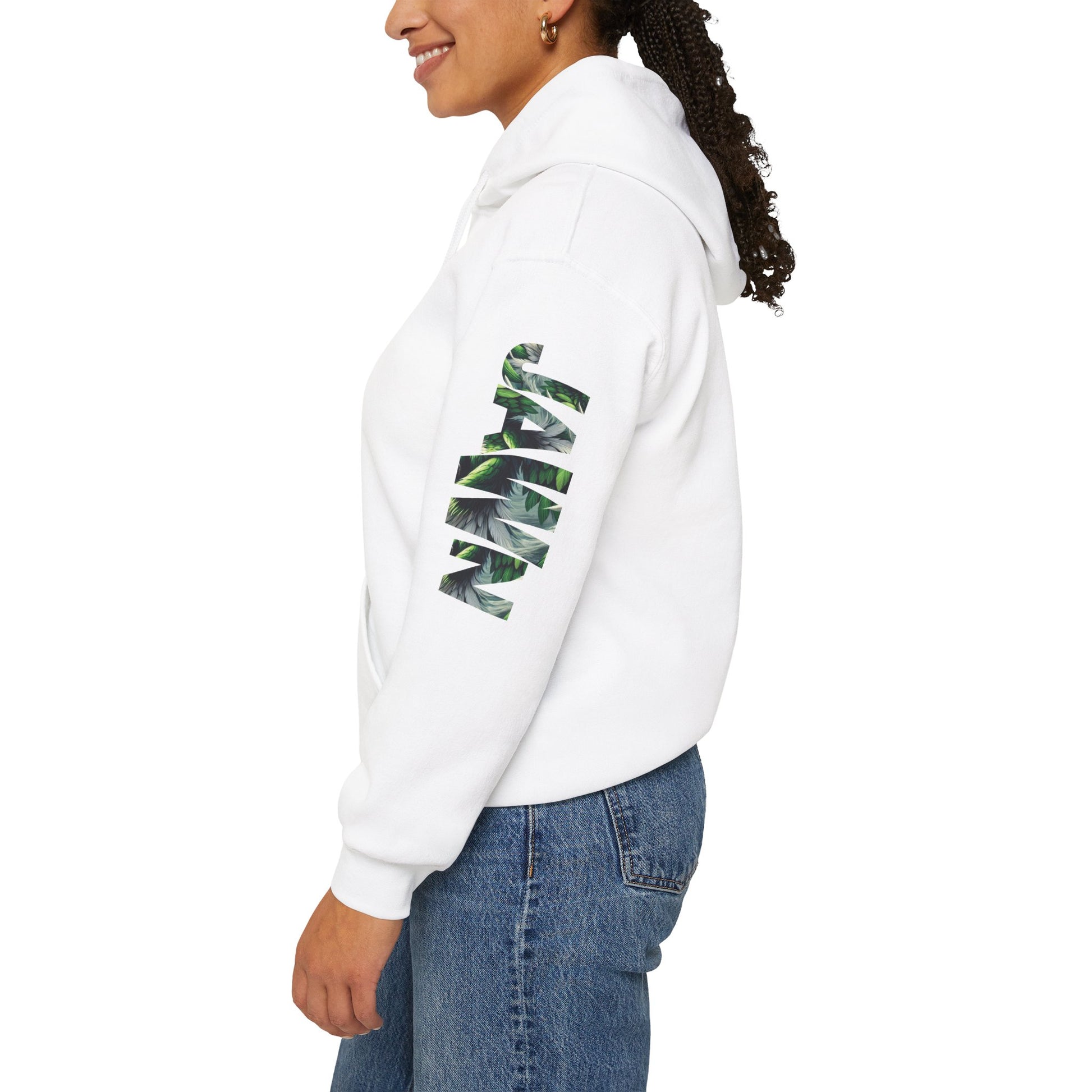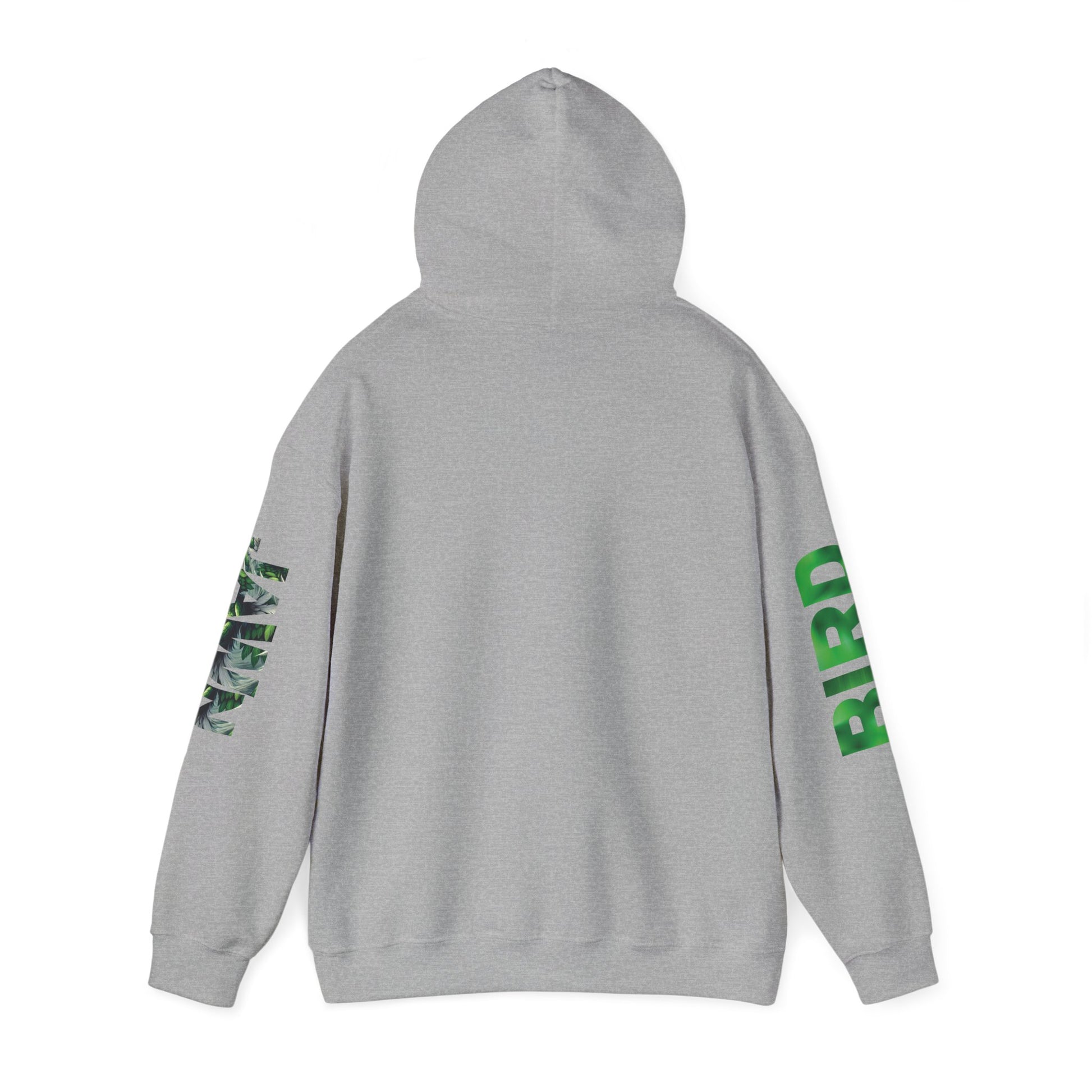 The hoodie features sleeve prints and a classic fit with a kangaroo pouch pocket and adjustable drawstring hood. Made with a cozy blend of 50% cotton and 50% polyester.