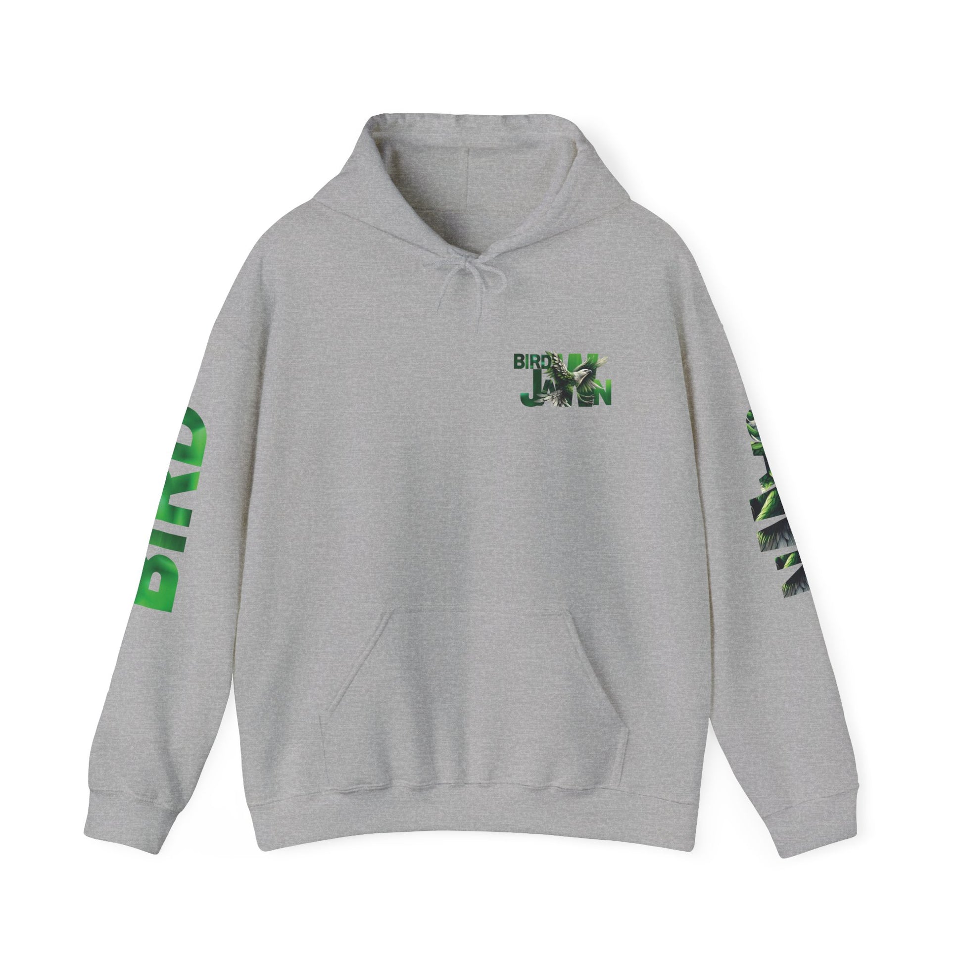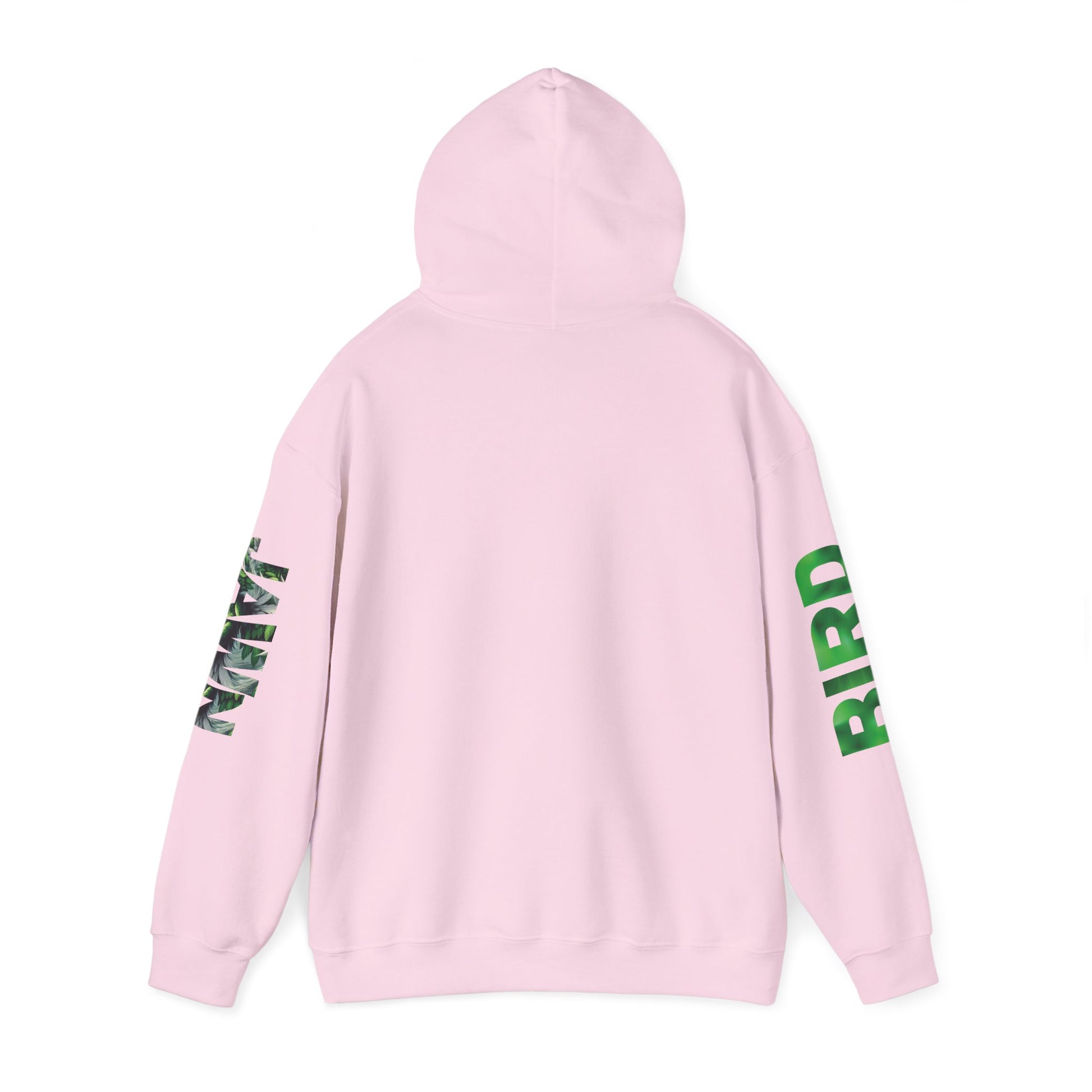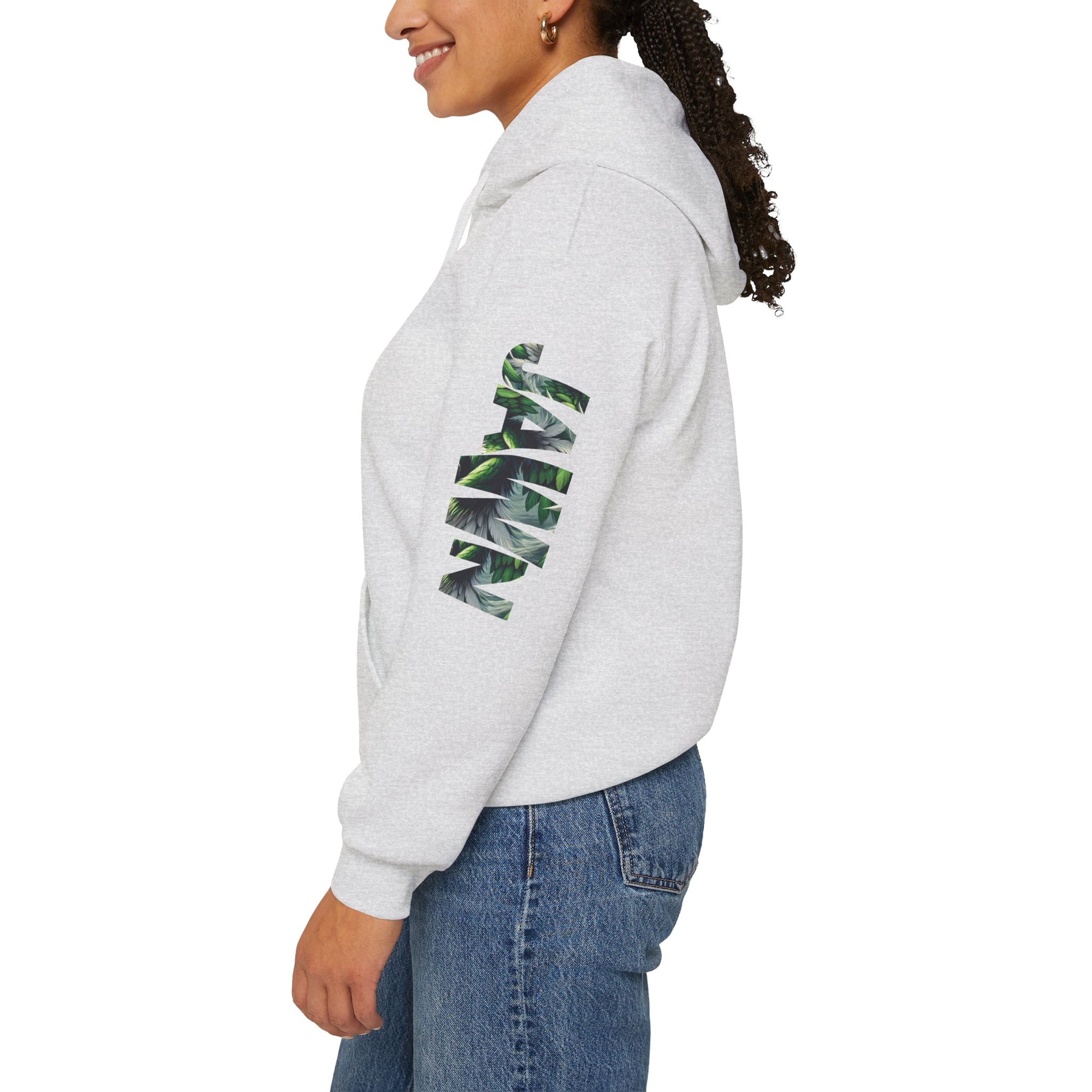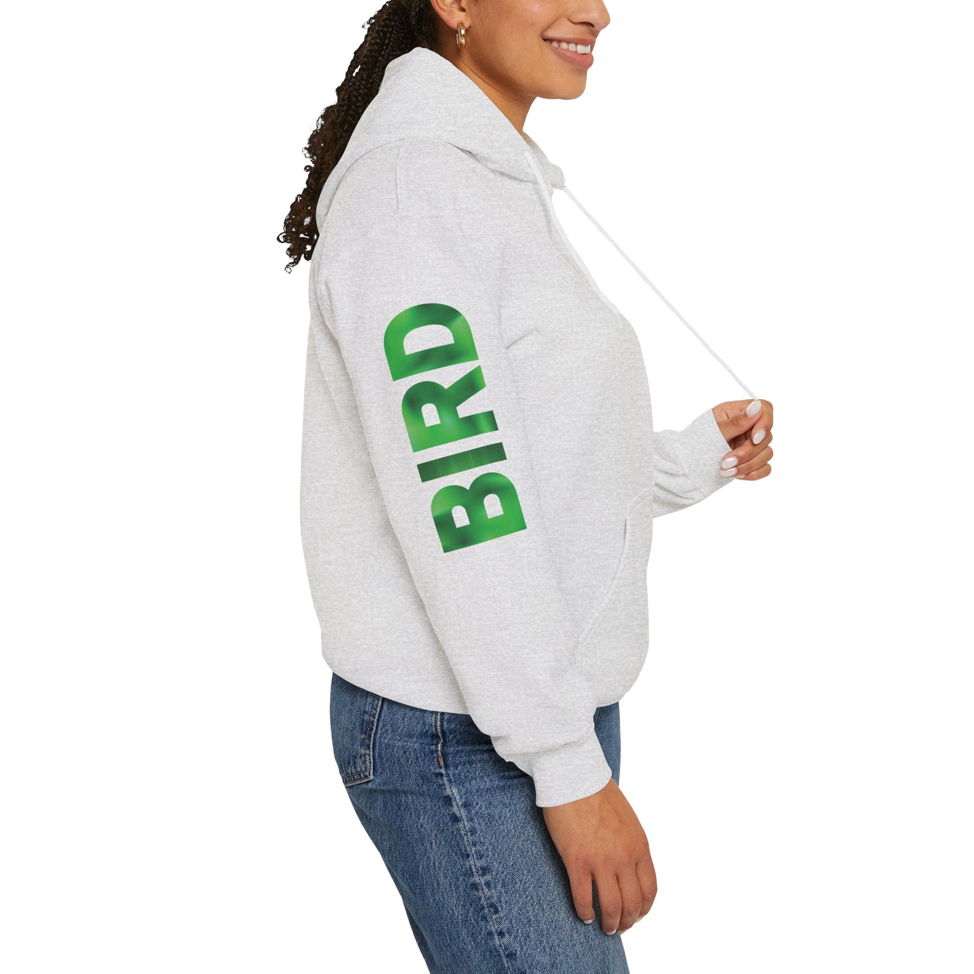 The hoodie features sleeve prints and a classic fit with a kangaroo pouch pocket and adjustable drawstring hood. Made with a cozy blend of 50% cotton and 50% polyester.